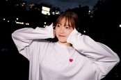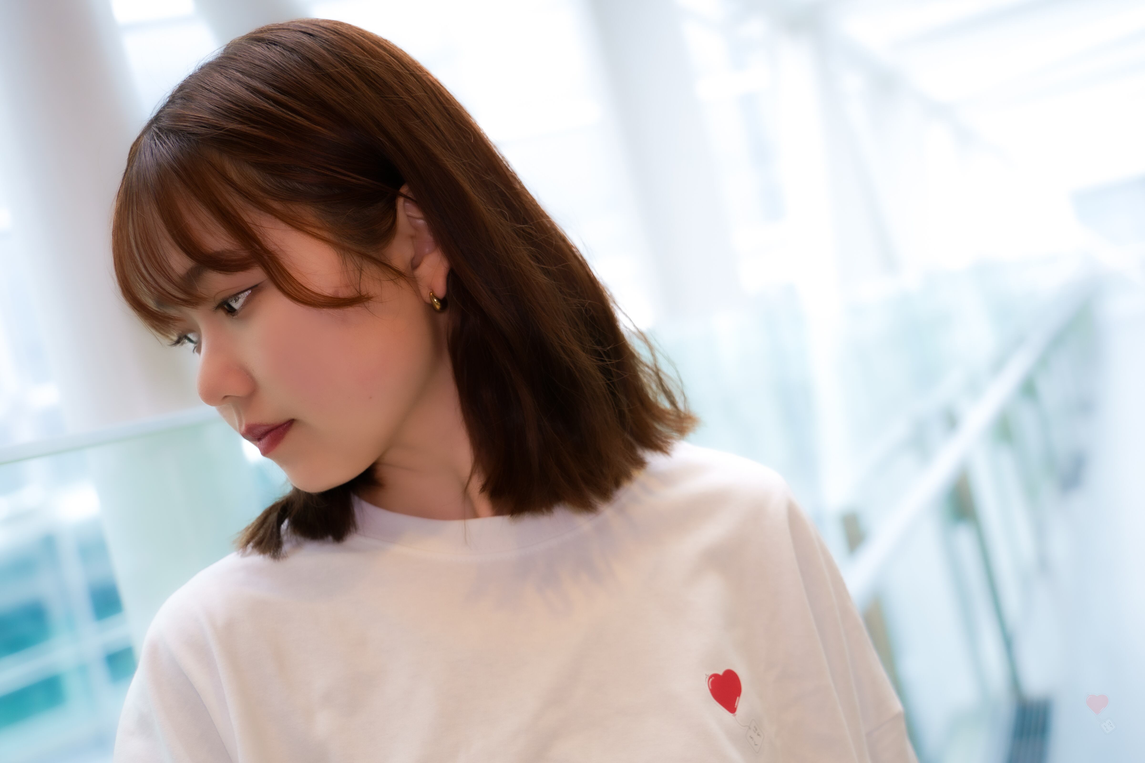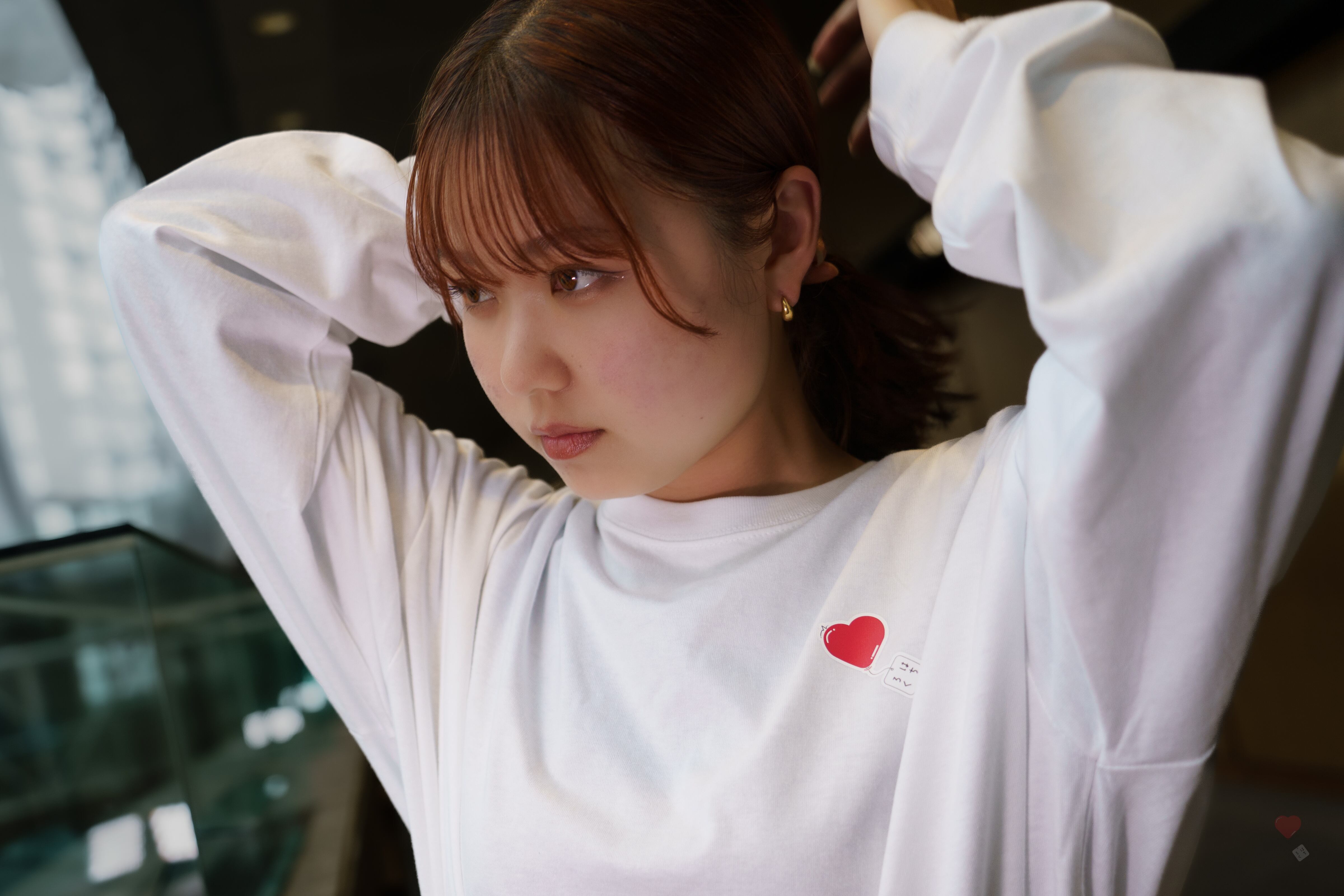 ハート型の風船に「はちろく」っとひらがなのタグがぶら下がっているアイコンがワンポイントに入ったシンプルなデザインのビッグシルエットタイプのロングスリーブ。デザインのシンプルさと春から少し暖かい季節まで対応できる着こなしやすさです